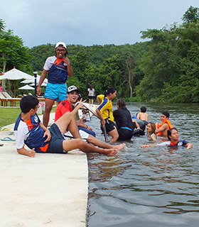 เรามีหน้าน้ำที่กว้างใหญ่ถึง300เมตร มีสะพานคอนกรีตทอดยาวไปตลอดแนวตลิ่งจึงทำให้สามารถเดิน นั่งเล่น ขี่จักรยาน ตกปลาได้ตลอดแนวสะพานโดยสะพานแห่งนี้ออกแบบคล้ายขอบของสระว่ายน้ำ มีบันไดขึ้นลงแบบสระว่ายน้ำ จึงทำให้หน้าน้ำแห่งนี้เหมือนสระว่ายน้ำ แต่เป็นสระว่ายน้ำธรรมชาติที่ใหญ่ที่สุดในแก่งกระจาน จึงสามารถขึ้นลงเล่นน้ำได้ตลอดแนวสะพาน มีเตียงนอนริมน้ำใต้ร่มขนาดใหญ่ตลอดแนวสะพานไว้นอนเล่นพักผ่อนฟังเสียงน้ำไหลจากเขื่อนแก่งกระจานและ เรามีบริการเสื้อชูชีพ ห่วงยางหลากสีขนาดใหญ่ไว้บริการ และสะพานแห่งนี้ยังใช้เป็นทางขึ้นลงเรือยางที่ล่องมาจากเขื่อนแก่งกระจานอีกด้วย